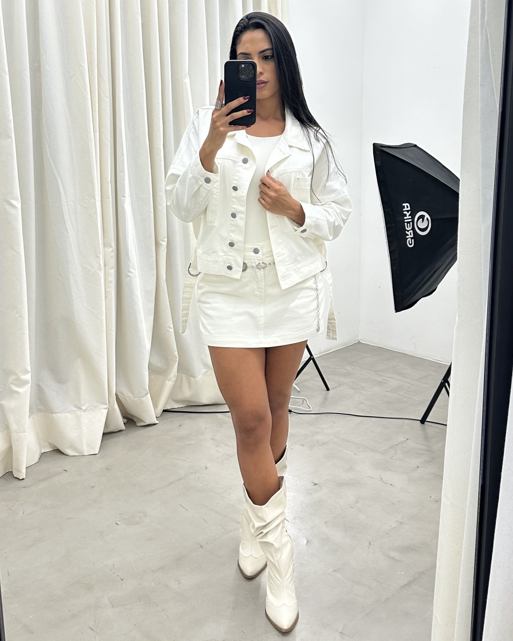 Nosso short saia possui um comprimento encurtado, com modelagem levemente solta ao corpo. Possui abotoamento frontal, bolsos e fechamento em zíper. Perfeito para combinar com nossa Jaqueta Gabi